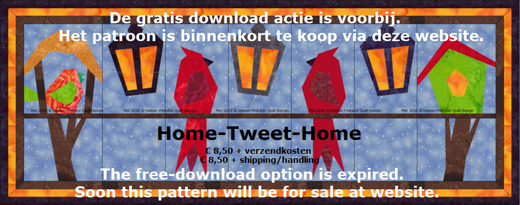 Many designers (worldwide) choose their favorit ‘Party interpretation’ for a quilt pattern. Each designer choose its own way to make it, so you can expect foundation/paperpiecing, traditional patchwork,applique… My pattern is ‘Home-Tweet-Home’. In this pattern you see a variation on the well-known ‘Tweet’ birds pattern, but also lanterns and a bird houses have been designed. See below for the scedual, starting at september 8, 2020. Every thuesday and thursday you can download some free patterns. The Row will grow and grow each time.